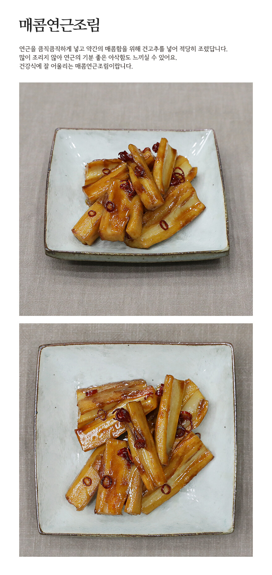 세로로 손질해 아삭아삭한 식감이 더욱 돋보이는 연근요리에요.