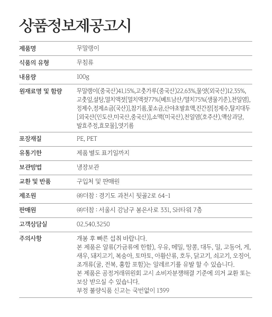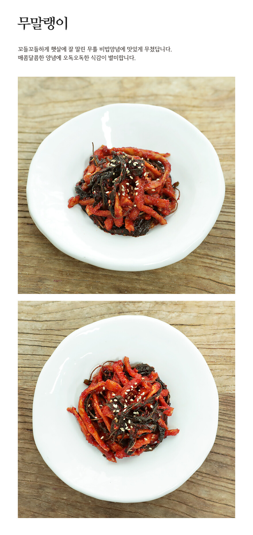 꼬들꼬들 햇살 잘 받아 말려진 꼬들 무에 자연스럽게 베인 비법양념이 씹을때마다 오독오독 맛있답니다.