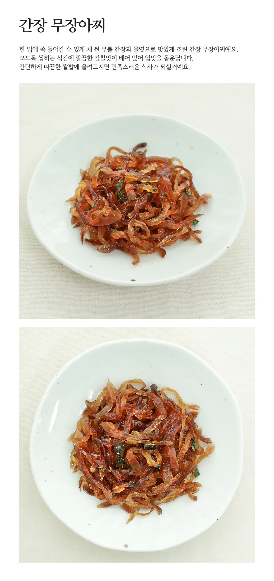 곱게 채 썬 무에 간장과 물엿으로 맛있는 무쳐냈어요.