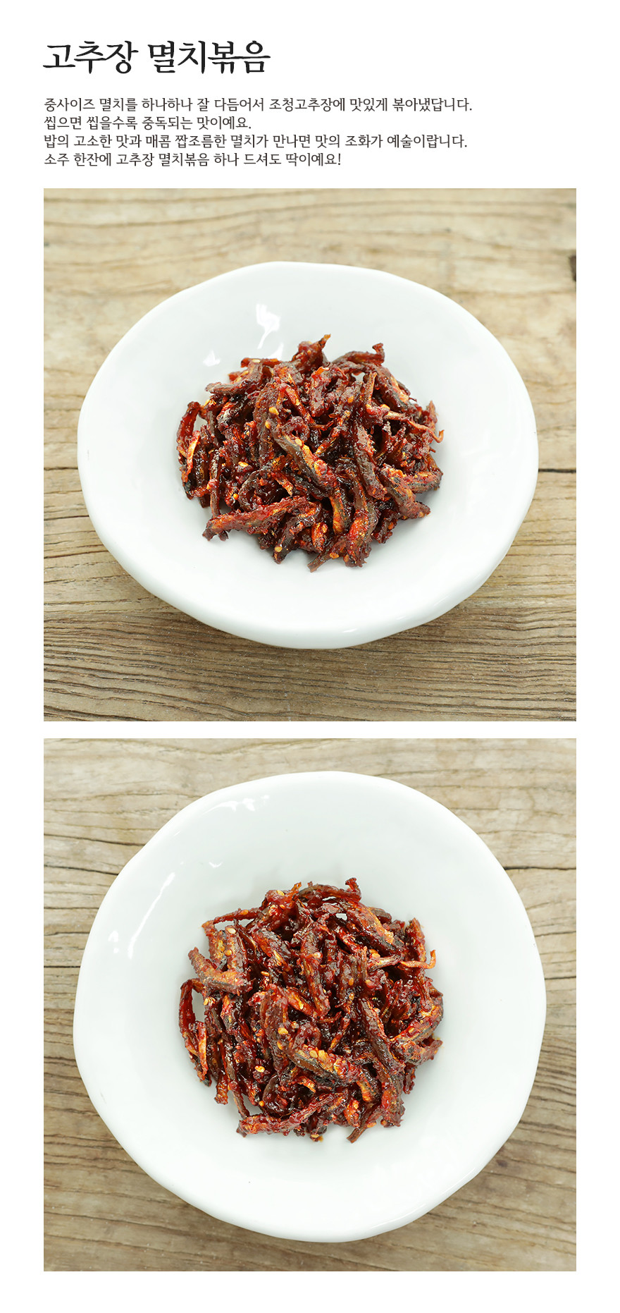 중사이즈 멸치를 잘 다듬어 조청고추장으로 맛있게 볶아냈답니다.