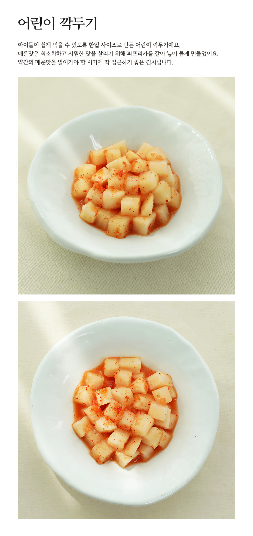김치 시작하는 어린이들에게 딱 좋은 시원한맛의 깍두기랍니다.