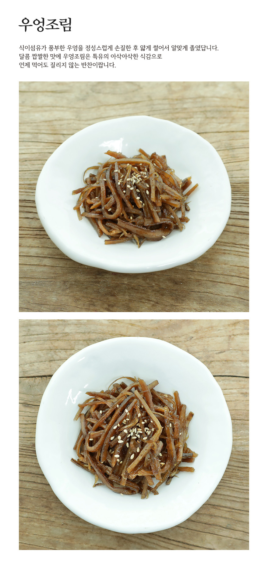 먹기 좋게 손질하고 채 썰어서 맛있게 조린 우엉조림이예요.