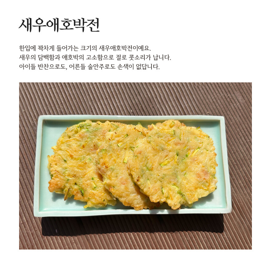 새우의 담백함과 애호박의 고소함이 느껴지는 새우애호박전입니다.