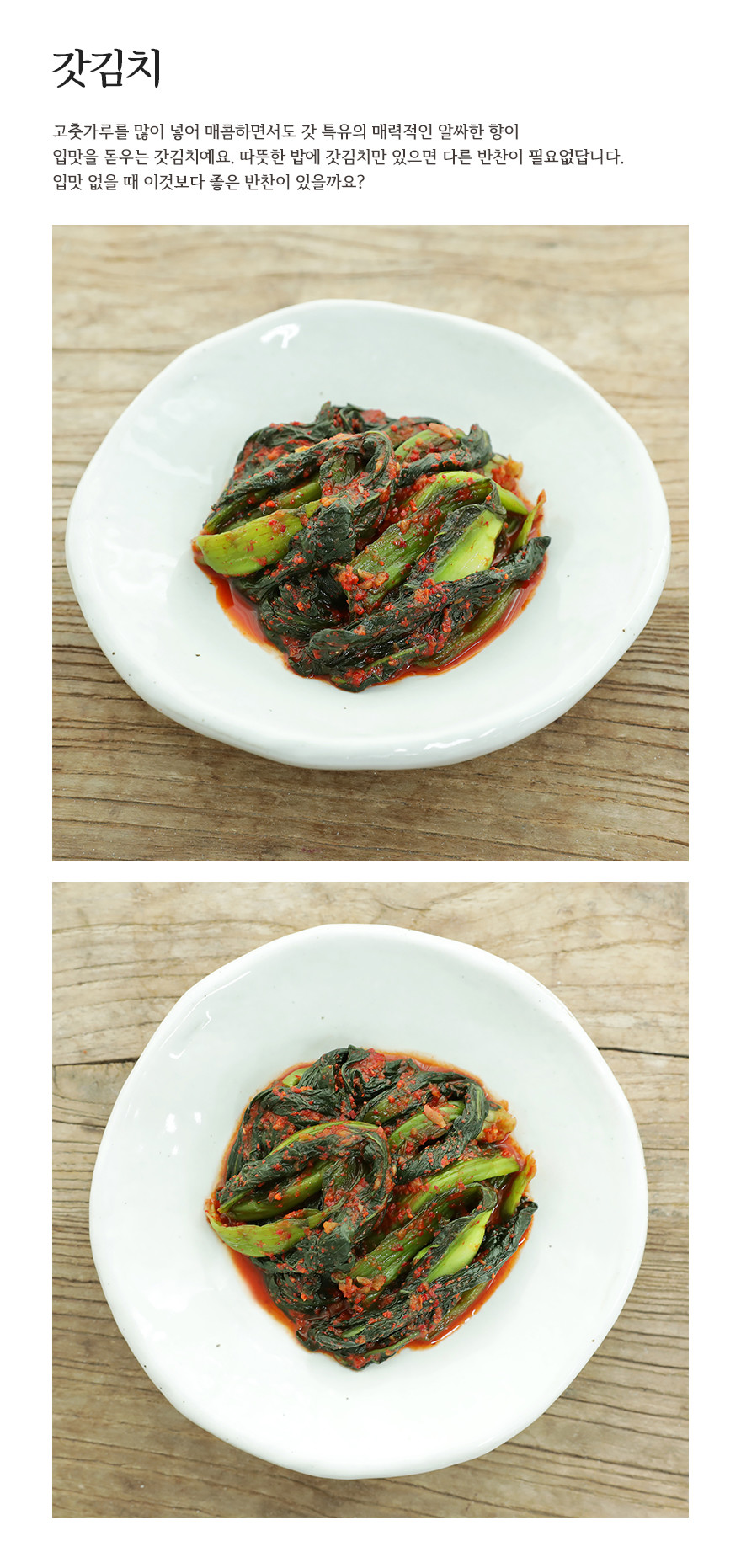 갓 특유의 알싸한 향이 입맛을 돋우는 갓김치예요.