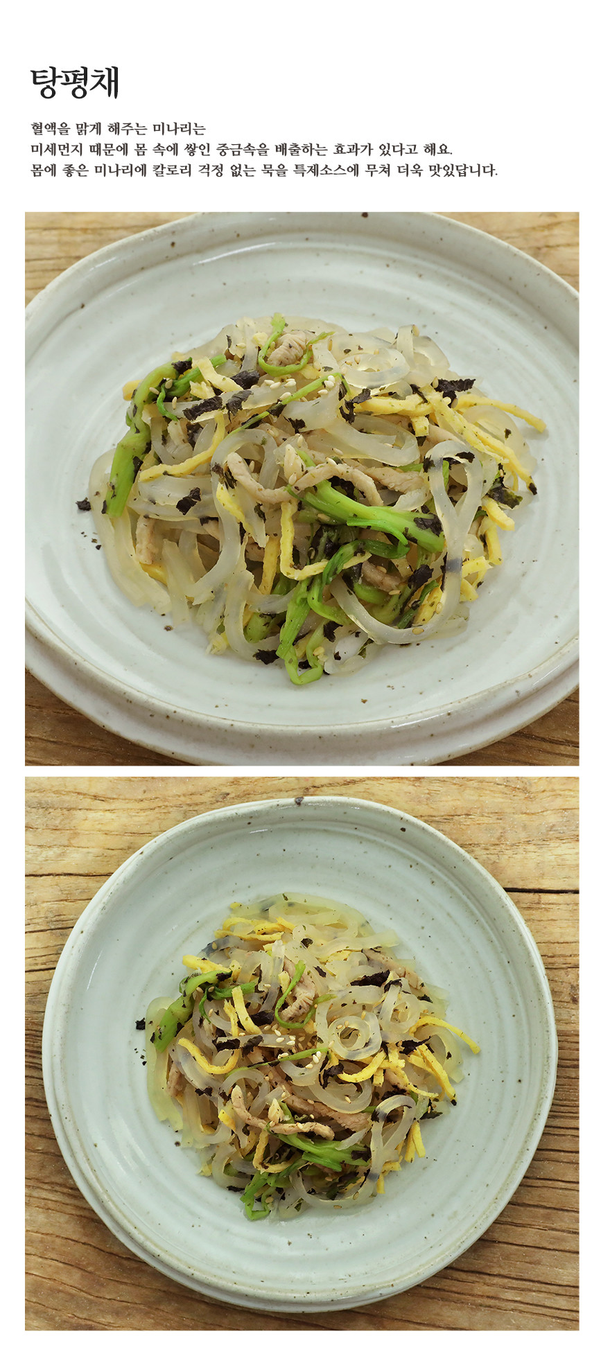 몸에 좋은 미나리와 칼로리 걱정없는 묵, 거기에 특제소스를 더한 탕평채입니다.
